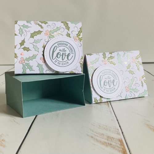 Each box measures 3.5 inches wide x 2.75 inches high x 1.75 inches deep and features a subtle shimmer on the sentiment. Sentiment reads “Surround yourself in the love of the season”